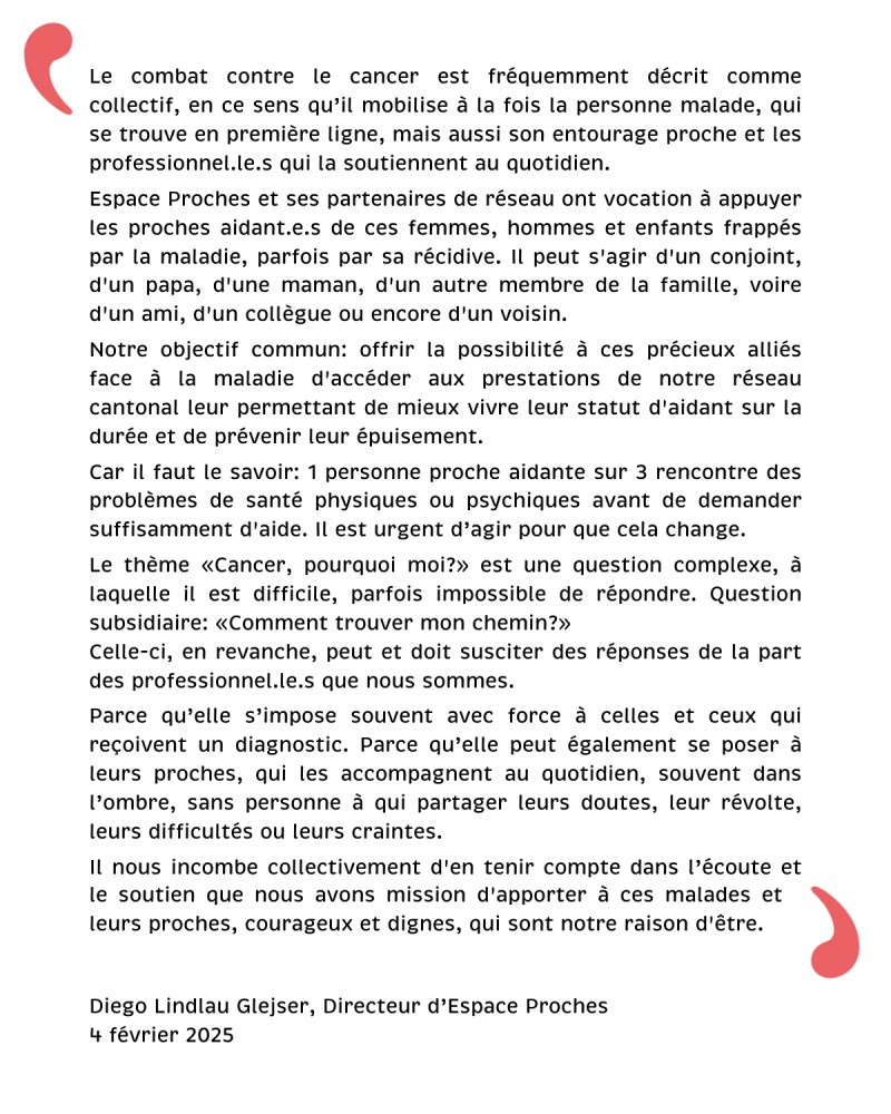 À cette occasion, Diego Lindlau Glejser, Directeur d’Espace Proches, a eu l’honneur de prendre la parole pour rappeler le rôle fondamental des personnes proches aidantes dans l’accompagnement des malades, et souligner l’importance pour elles de ne pas attendre d’être à bout de forces pour demander du soutien.